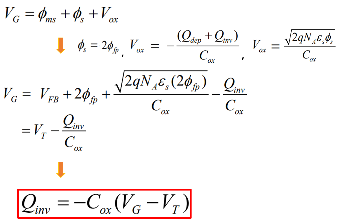 이제 Inversion mode를 수식으로 표현해보면, Qacc=−Cox(VG−V−FB)와 유사한 것을 알 수 있다.