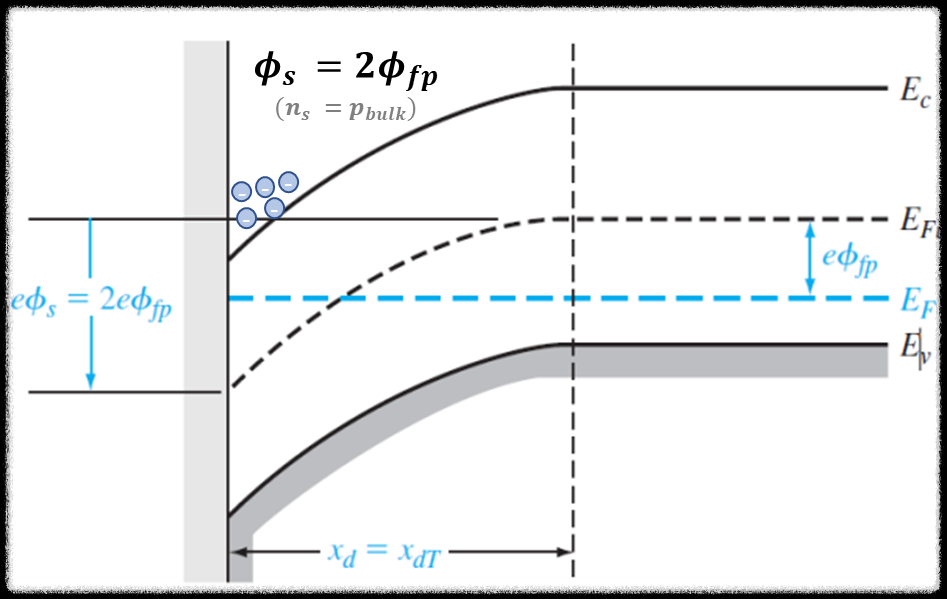 이제 threshold voltage를 인가했을 때를 수식으로 표현해보자. VT를 인가하면 ϕs=2ϕfp이므로 ϕs는 2ϕfp로 바꾸어 표현해도록 하겠다.