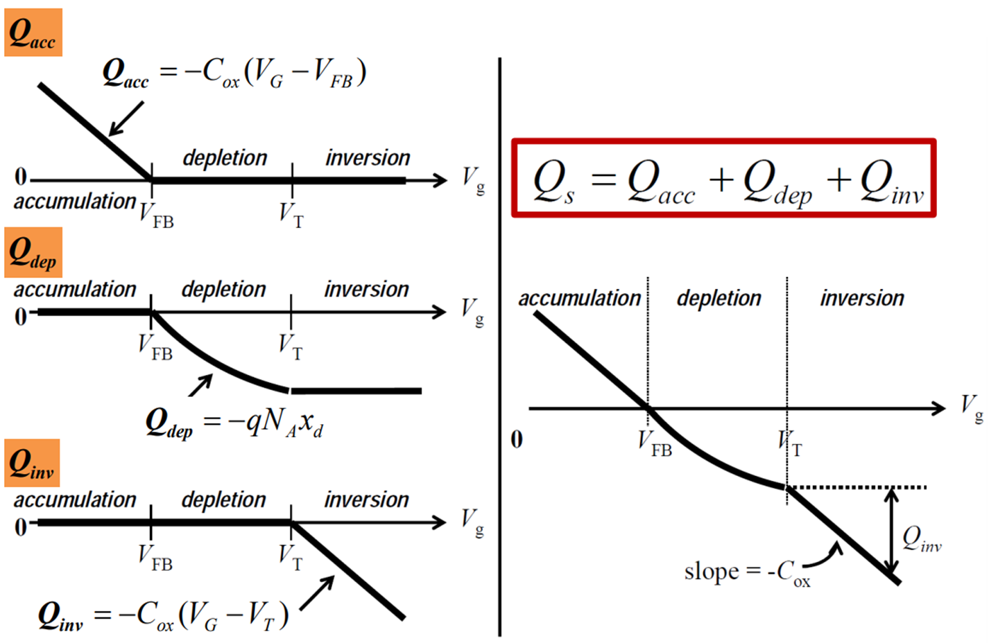 마찬가지로 도출한 charge 수식을 통해, total charge density Qs=Qacc+Qdep+Qinv를 아래와 같이 그릴 수 있다. 아래의 그래프는 MOS capacitor뿐만 아니라 MOSFET을 이해할 때도 굉장히 중요한 역할을 하기 때문에 위의 operation mode 수식 유도 과정부터 아래 그래프까지 완벽히 이해하기를 바란다.