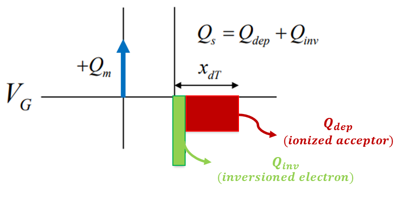 위의 그림은 depletion mode의 MOS capacitor로 metal에 인가된 (+) charge에 의해 semiconductor의 hole들이 경계면에서 멀어져 depletion region이 형성된 상태이다. Depletion region에 의한 charge Qs −qNAxd이고 이것을 Qdep라고 한다. 마찬가지로 Qdep는 Qm에 대응되는 charge이다.